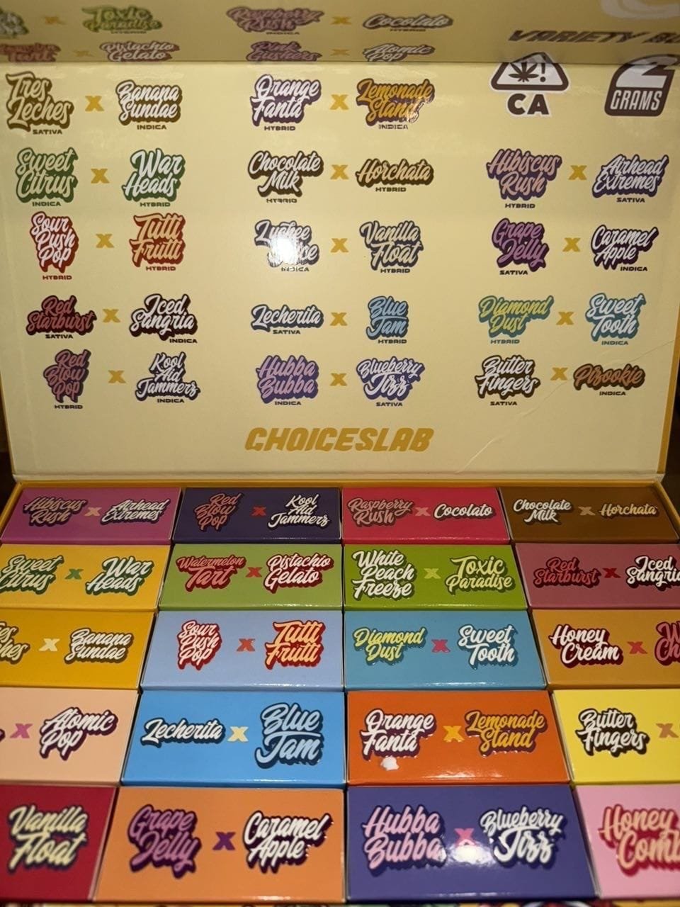 Blueberry Sundae(Hybrid) x Pink Goat(Indica), Fruity Pebbles(Hybrid) x Sour Heads(Sativa), Grape Drank(Hybrid) x Ginger Ale(Hybrid), Orange Creme(Indica) x Tropical Lime(Indica), Glazed Donut(Hybrid) x S'mores(Sativa), Juicy Watermelon(Indica) x Raspberry Cough(Sativa), Candy Grape(Indica) x Strawberry Milk(Hybrid), Sugar Cookie(Hybrid) x Glacial Guava(Hybrid), Sugar Plum(Hybrid) x Green Crack(Indica)